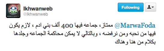 ثم، وفي إطار المحادثة التي إشتهرت ب"محادثة لماذا تكرهونا؟"، كتبت @IkhwanWeb هذه التويت، ردا على إحدى التعليقات: